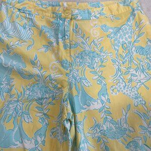 Lilly Pulitzer Tropical Print Pants Women's size 4 Yellow and Blue Beach Coastal Preppy Cotton Blend