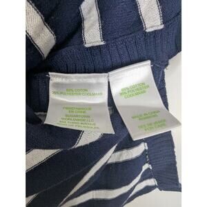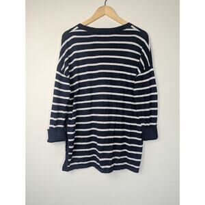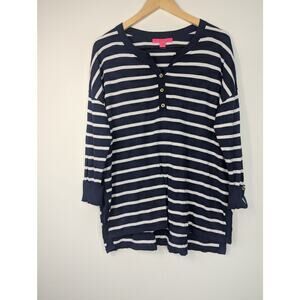 Lilly Pulitzer True Navy Moonlight Stripe Faraway Sweater. Drop shoulder, 3/4 sleeves with flipped cuffs, 3 button detail, relaxed fit.