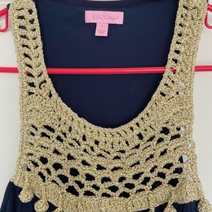 Excellent condition Lilly Pulitzer Rachelle dress in True Navy. Size small. Such a gorgeous and easy to wear dress! Beautiful gold crochet details.