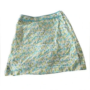 Trendy and cute for summer. Aqua and yellow tulip print. White shorts underneath. Front button closure pockets. One back pocket. Side zipper closure.