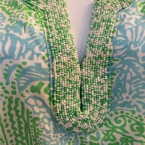 Excellent condition! Vibrant tunic with intricate green and blue patterns. Features a fully beaded neckline. Cotton. Women’s size medium.