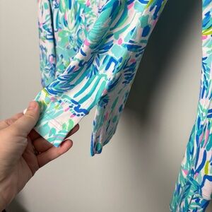 Bright and colorful blouse with a tropical print. Slight vneck with strings on each side and gold engraved Lilly hardware on the ends. Features shades of blue, green, and pink. Size medium. Great condition!