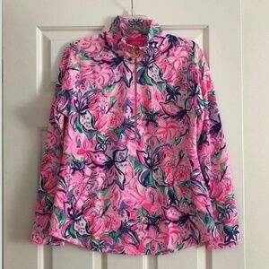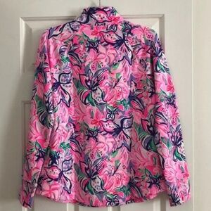 Like New Lilly Pulitzer UPF 50+ Skipper Popover Multi Isn't She Lilly XXL Pink and Purple. I've worn this twice before dropping a size, so it's up for sale. So colorful and soft - perfect for that working or evening walk or extra layer on a plane. comes from a smoke-free and pet-free home.
