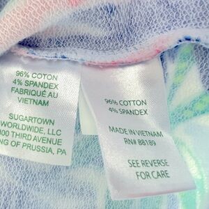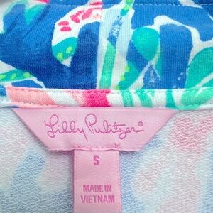 This Lilly Pulitzer top showcases a vibrant blue graphic design with a notched collar and long sleeves. The button-down style adds a touch of elegance, making it perfect for both casual and resort wear. Its lightweight fabric ensures comfort and style throughout the day.