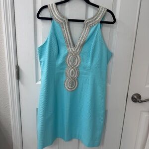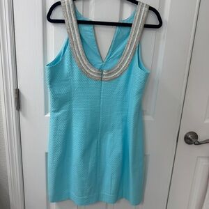 Turn heads in this stunning Lilly Pulitzer Valli Shift Dress — a true classic from Lilly’s signature collection. This sleeveless shift features a textured aqua blue fabric with a striking metallic gold and silver embellished neckline and front detail. A timeless silhouette that embodies effortless resort sophistication.