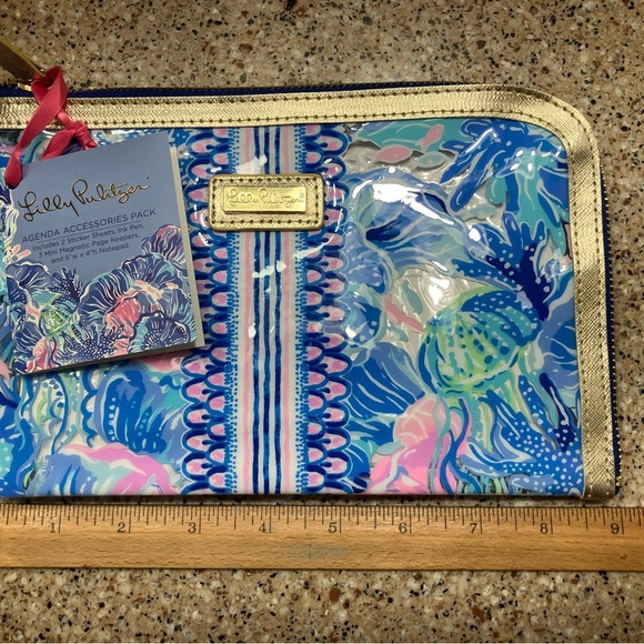 Colorful accessory with blue, pink, and gold design. Features signature Lilly Pulitzer style. Only opened to show contents inside. All items never used. Smoke free & pet free home. Size estimates included in pictures.
