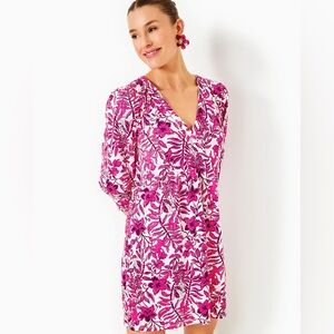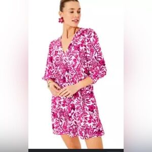 Bold floral pattern. Ideal for sunny outings. Effortlessly chic. Lilly Pulitzer Vibrant Pink White Mini Cass Dress Lil Escape Print HTF XL NWOT Tagged blacked out to prevent returns - care tags cut as shown in pics 100% cotton fits small see measurements.
