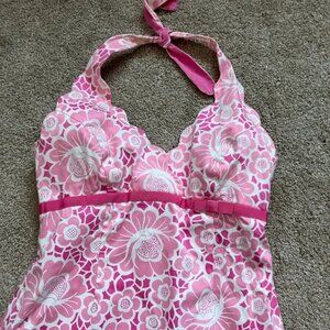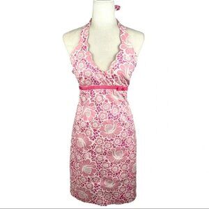 Lilly Pulitzer Vintage Pink "Belle of Lillyville" Halter Scallop Dress - DETAILS: pink/white floral print, * Cotton/spandex, * Lined Padded cups, * Scalloped neckline trim, * Halter style with tie behind the neck, * Back zip closure, * Grosgrain bow detail at empire waist, * Fully lined, * Sheath silhouette, * Midi length, * This dress is special edition “Belle of Lillyville” derby print from spring 2006 retired, Hippie floral, 70’s floral, bold color, barbiecore, preppy, summer, vintage. Tags - Nautical, coastal, preppy, layer, boho, floral, cottagecore, coastal grandmother, relaxed fit, comfortable, casual, business casual, weekend, date night, fall, winter, spring, summer, party, wedding, shower, cute, trend