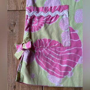 Vintage shift dress from Lilly Pulitzer. Girls size 4. Light lime green sleeveless shirt dress with pink seashell print. Two front patch pockets. Side vent bows. Zipper closure down the back. Lined. Good used condition; there was a tear on the back neckline that has been repaired as shown in last photo.