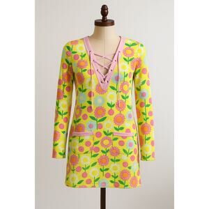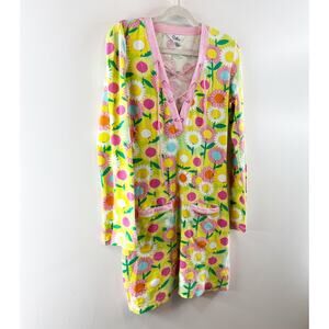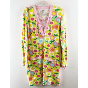 Lilly Pulitzer Vintage Terry Cloth Long Sleeve Floral Mini Cover Up Dress Yellow
