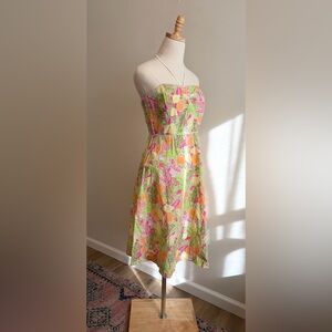 Authentic vintage Lilly Pulitzer strapless dress featuring a vibrant citrus and tropical print in signature pink, green, and orange hues. Classic fit-and-flare silhouette with a defined waist and flowy skirt, flattering and timeless. Includes a halter tie option for added support. Lightweight fabric makes it ideal for summer, resort wear, brunch, or vacation styling.