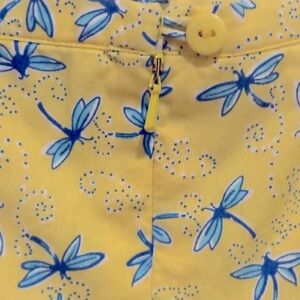 This is a gorgeous little A-line yellow mini skirt from Lilly Pulitzer in a women's size 8. It has little blue dragonflies all over it. It's a vintage Lilly Pulitzer designer skirt, and is in great condition with no flaws! Embrace a playful vibe with this knee-length A-line skirt from Lilly Pulitzer, featuring a cheerful yellow backdrop adorned with whimsical blue bird prints. Perfect for casual outings or resort wear, its lightweight fabric ensures comfort and style in warm weather.