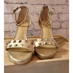 Lilly Pulitzer Gold Wedge Sandals- Size 7- Wear noted- has small scrape area to back of heel. See photos