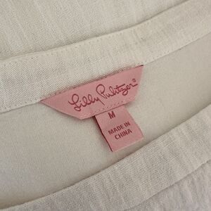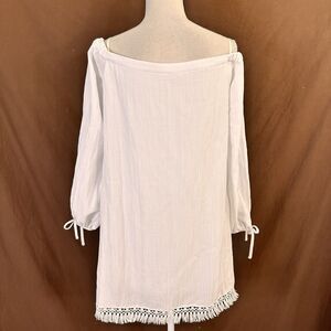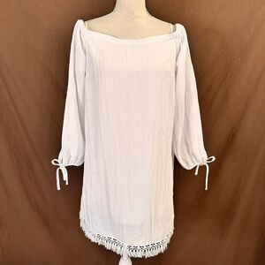 Lilly Pulitzer Adira Dress Resort White. Size Medium. About 30" in length. Sleeved off the shoulder dress with tie details at the wrist. The fringe details at the hemline. Palm Texture (90% Rayon, 10% Nylon). Dress is lined and not see thru.