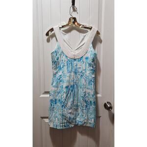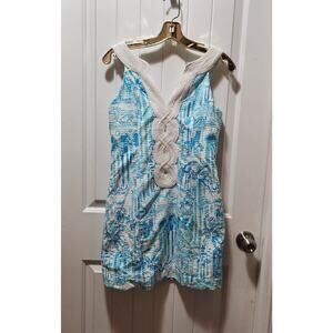 The Lilly Pulitzer White Aqua Blue Cord Embelished Cotton Dress is a stylish and vibrant option for women looking for a colorful and fun outfit. This sleeveless dress features a flattering V-neckline and a short length, perfect for summer and spring occasions like parties or casual wear. The blue floral pattern, accented with embroidery, adds a touch of flair to this pencil dress. Made from 100% cotton and lined for comfort, this dress is sure to make a statement and turn heads wherever you wear it.