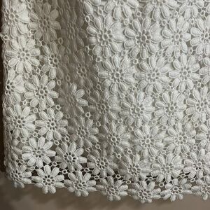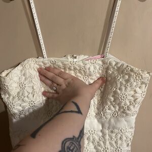 A Beautiful white strapless empire waist dress with allover novelty lace.