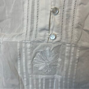 Pristine 100% Cotton swim cover up tunic dress. Semi sheer, lightweight, embroidered, with branded buttons. One tiny flaw on the back where the pattern of threads is off a bit on the open thread detailing, see pix. No other flaws.