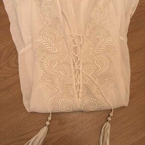 Gorgeous and flowing Lilly Pulitzer white tunic/caftan, perfect as a stylish beach cover-up or a light summer dress. Features beautiful, detailed tonal embroidery around the V-neckline and a trendy lace-up tassel detail. The silhouette is relaxed and oversized, finished with a subtle ruffle/tiered hem at the bottom. Made from a lightweight, airy fabric that is ideal for warm weather. The kaftan sleeves add an effortless, resort-ready vibe.