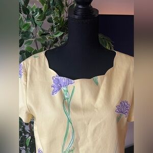 Lilly Pulitzer White Label RARE - Solid Yellow Dress with Purple Flowers Solid yellow with individual green-stemmed purple flowers with the name Lilly next to each stem. This solid background with individual flowers is very unique compared to the typical watercolor multi-prints Lilly is know for. This will holds its value as its 100% cotton and a hard-to-find vintage print. Vintage 1990's per black and white Lilly Pulitzer label. Gently used condition.