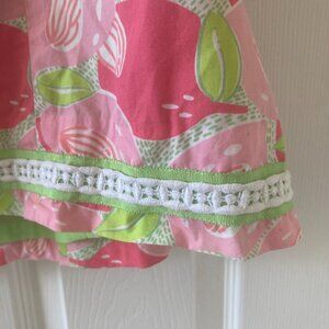 Lilly Pulitzer "Sabrina" Strapless Tie Back dress in green and pink peach pattern, size 8. Has a vintage white label. Peach pits have a hidden 'Lilly' signature! Features ribbon embroidery trim, fully lined with boning part way down the sides, zipper back with a tie at the top. VGUC - no visible stains or rips!