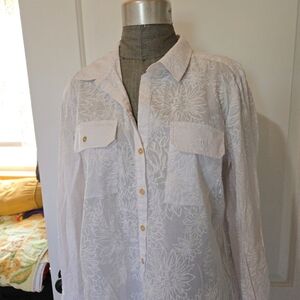 Nice Lilly Pulitzer Captiva Tunic Top, Size M. White color with a sheer floral design, Has front breast pockets and button neckline.