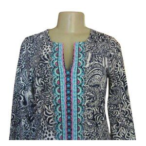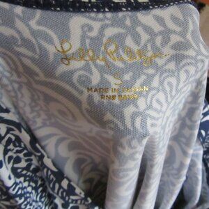 This Lilly Pulitzer blouse combines intricate wildlife-inspired patterns with elegant aqua and pink detailing. Its lightweight fabric and flattering fit embody refined casual style. Nice design to the front of the blouse. Most of the wild elephants etc can be seen on the back of the blouse. In nice shape in size small. Please see the photos. 94 percent nylon and 6 percent spandex.