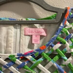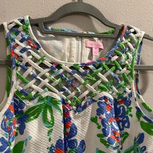 Beautiful Lilly Pulitzer shift dress in excellent condition, size 0. Features a vibrant bluebonnet floral print with green accents and a unique lattice neckline detail. Sleeveless design with a flattering, classic silhouette. Measures approximately 30” across the chest and 31” in length. Perfect for spring and summer events!
