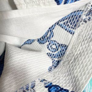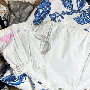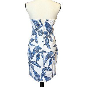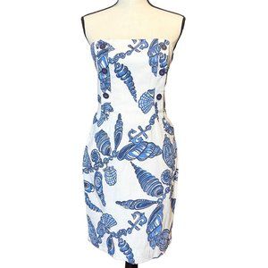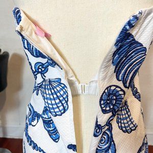 Lilly Pulitzer Vanna dress in Fallin in Love classic white and blue shell print. Strapless with a rubber trim to keep it from moving too much. Has a built in corset with bra like closure. Wave jacquard fabric. Minor fade to the print. Pockets on both sides. Tagged size 4 but runs small especially in the bodice, so best for 0-2 imo, but review measurements.