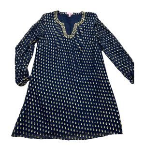 Lilly Pulitzer Women’s 4 Navy Crinkle Clip Silk Jacquard Dress Navy Gold