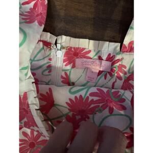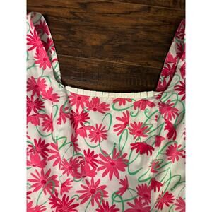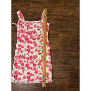 In good condition! This Lilly Pulitzer Women's Dress in size 4 features a white and pink floral pattern, making it perfect for summer days at the beach or casual travel. The sleeveless design and square neckline add a touch of sophistication to this mini shift dress, crafted from a comfortable cotton blend material. With a zipper accent and preppy theme, this coastal-inspired dress is a stylish choice for the warmer seasons of spring and summer.