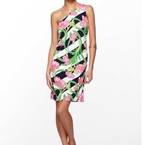This is a lovely Lilly Pulitzer Madison dress in a size small. The dress features a vibrant 'Jumping the Line' floral print with stylish stripes. It has a flattering one-shoulder design and ruched sides for a comfortable and chic fit. Made from a soft and stretchy rayon blend jersey fabric, this dress feels great against the skin. Approximate length: 38.5" pit to pit- 13" waist- 10.5" This dress is in great pre-loved condition, showing only normal signs of wear. There are no flaws, stains, or tears to note.