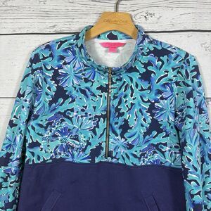 The Lilly Pulitzer Women's Medium Half Zip In Too Deep Asher Popover is a colorful and stylish sweatshirt perfect for activewear occasions. Made from a comfortable blend of spandex and cotton, this pullover features a collared neckline and long sleeves for added style and warmth. The floral pattern and beach-themed accents make it a great choice for beach, walking, or golf activities. With a zipper closure, graphic print, and stretch material, this sweatshirt is both functional and fashionable for all seasons.