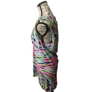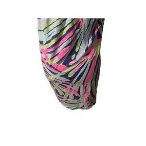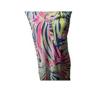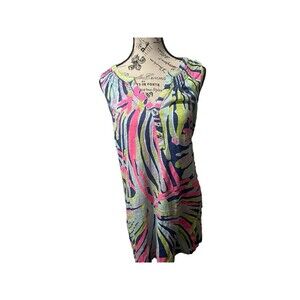 This beautiful Lilly Pulitzer dress is perfect for any occasion. The stunning pink and blue tie-dye pattern is sure to turn heads. The dress features a sleeveless design with a round neckline and a pullover closure, making it easy to wear. The shift style and short length make it perfect for a casual day out or a party.
