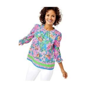The Lilly Pulitzer Women's Rose To The Occasion Trista Blouse Top in size Large is a stylish and feminine top perfect for any occasion. This floral patterned blouse features long sleeves, a round neckline, and is made from 100% cotton for added comfort. The pink color and rose theme add a touch of elegance, making it a versatile piece for your wardrobe. With a regular fit and basic style, this blouse is both lightweight and easy to wear, making it a must-have for women looking for a chic and trendy top.