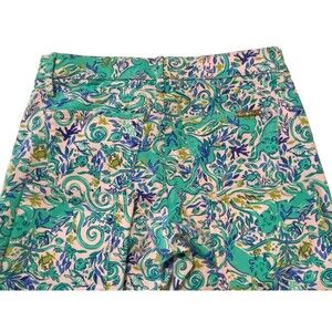 The Lilly Pulitzer Women's South Ocean Skinny Pant in Monkey Sea Melon Fig is a regular-size 4, multicolored pair of jeans with a light fabric wash. Beautiful colors of blues & greens, these jeans features a skinny style and are cropped at the ankle. New without tags. Perfect!