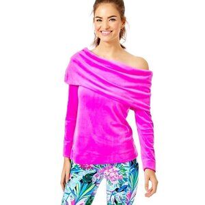 Lilly Pulitzer womens sweatshirt in medium size offers a comfortable, off-the-shoulder style. The sweatshirt is made of soft velour in a beautiful purple color, perfect for casual wear.
