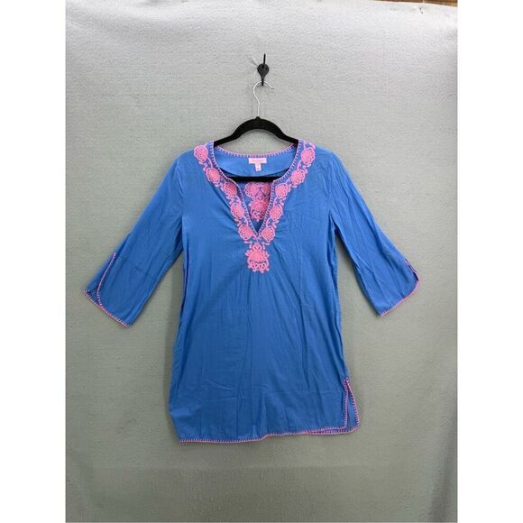 Lilly Pulitzer Womens Blue Split Neck Embroidered 3/4 Sleeve Cover-up Dress XS