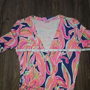 Step into bold, playful elegance with this Lilly Pulitzer wrap-style romper, a statement piece designed for both comfort and standout style. Featuring a vibrant tropical floral print in shades of pink, coral, orange, green, and white on a navy background, this romper embodies the signature Lilly Pulitzer aesthetic — colorful, joyful, and chic.