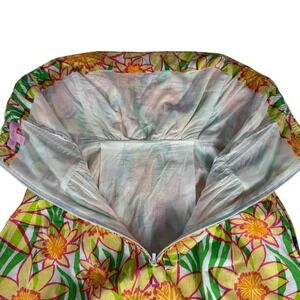 Lilly Pulitzer strapless cotton sun dress in a vibrant yellow, green, and pink floral print. This mini-length dress features a classic tube-style bodice with boning with a gathered empire waist that flows into an A-line skirt. Crafted from breathable 100% cotton shell and lining, it includes a hidden back zipper closure and internal silicone grip tape along the neckline for a secure fit. The bold tropical flower motif makes it a perfect choice for summer parties, beach vacations, or resort wear.