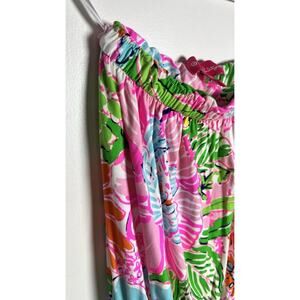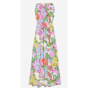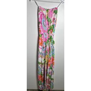 The Lilly Pulitzer X Target Dancing On The Deck Size XS Floral Stretch Maxi Dress is a vibrant and stylish addition to any woman's wardrobe. This sleeveless, strapless dress features a beautiful floral pattern in multiple colors, perfect for summer and spring occasions. Made from a comfortable and stretchy rayon/spandex blend with a soft jersey fabric type, this long maxi dress is easy to care for with machine washable instructions. The dress is ideal for travel, parties, or casual outings, adding a touch of Lilly character and feminine flair to any ensemble.