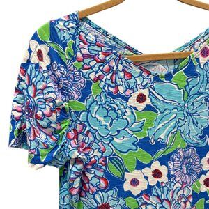 Lilly Pulitzer XL Floral V-Neck Top Leila May Floral 100% Cotton Blue/Green Shor