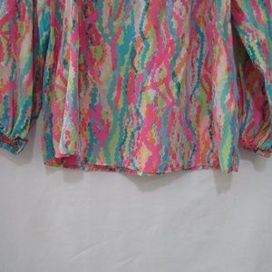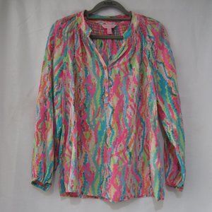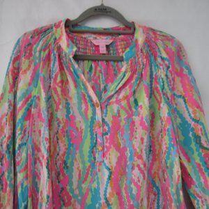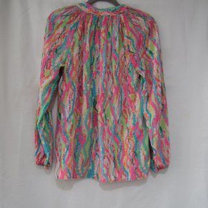 Lilly Pulitzer Blouse. XS. This is the Elsa blouse, in Multi. Pattern is Dripping in Jewels. Hard to find pattern. Pull over popover, with smocked neckline. 3 gold button closure. Long sleeve with elastic cuffs. 100% Silk, dry clean. Clean with no issues stains or odors. Comes to you clean and ready for immediate wear.