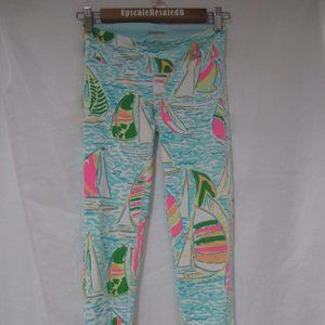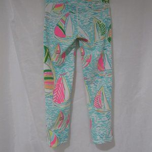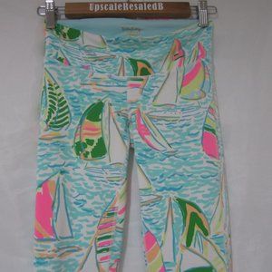 Lilly Pulitzer Leggings. XS. This are the Weekender UPF 50+ Cropped Leggings, in You Gotta Regatta. Color is Seaside Aqua. Highly desirable. All over Sail Boat print. Show as brand new. Bright vibrant bold all over pattern. Back waistband open pocket. Polyester spandex blend, machine wash. Freshly laundered with no issues stains or odors, comes to you ready for immediate wear. Style 25219