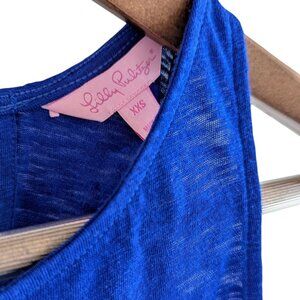 Lilly Pulitzer Size XXS Rexie Tassel Tank Twilight Royal Blue. Sleeveless, Lightweight 60 cotton/40 polyester. Fabric has some stretch. Made in Indonesia.
