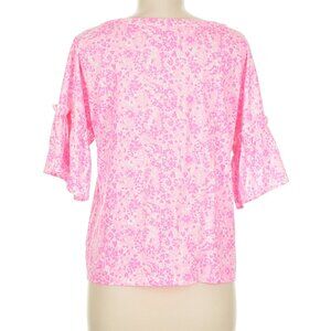 This Lilly Pulitzer top features a vibrant pink and white pattern, perfect for adding a pop of color to your wardrobe. The shorter bell sleeves and ruffled details create a playful and feminine silhouette, making it an ideal choice for casual outings or special occasions.