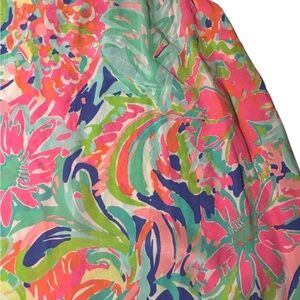 This sleeveless camisole by Lilly Pulitzer showcases a lively blend of pink and blue in a tropical print. Its airy fabric and flowing silhouette make it an ideal choice for warm weather, exuding a resort-inspired elegance.