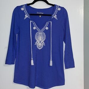 Lilly Pulitzer blue notch neck top with soutache embroidery and tassel ties XS