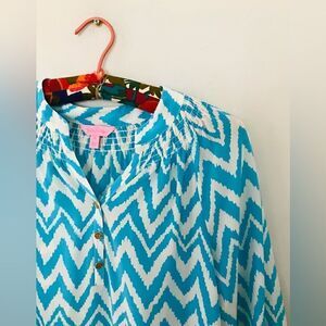 Lilly Pulitzer | blue and white 100% silk peasant top with gold logo buttons XS