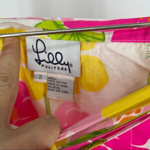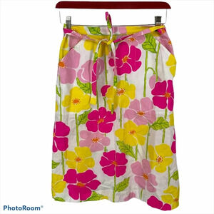 Lilly Pulitzer pink and yellow floral wrap skirt. Sweet Sally. This is in exellent condition with no stains or holes. It has pockets!! The total length is 24 inches and the waist when tied is about 13 inches but can give or take a couple because of the wrap design. Size is 2. So Xs or S