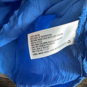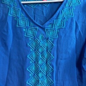 This elegant blouse from Lilly Pulitzer for Target showcases a vibrant blue hue with intricate embroidery along the V-neckline and down the front. The 3/4 sleeves and lightweight fabric ensure a comfortable and stylish fit, making it a versatile addition to any wardrobe.